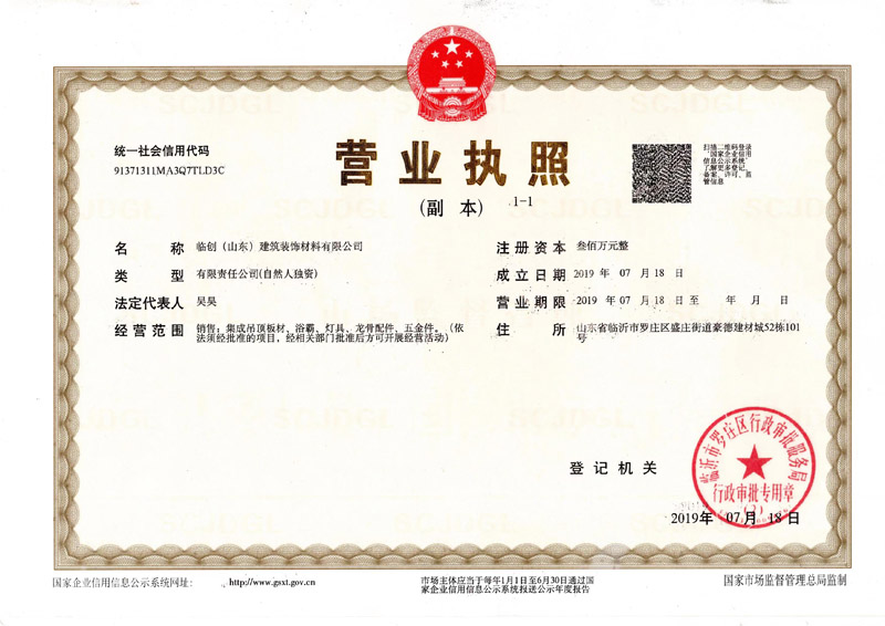 臨創(臨沂)建筑裝飾材料有限公司是一家集成吊頂批發廠家板材、浴霸、燈具、龍骨配件、五金件等集成吊頂材料于一體!主要經營:UV印刷、冰花、覆膜、磨砂、滾涂、抗油污、珠光雙色、鏡面、鐳射、凹凸,生產滾涂拉絲、珠 光,等規格的集成吊頂鋁扣板半成品片料。應用于廚房空間、衛浴空間、餐廳空間、客廳空間、臥室空間、書房空間、過道空間、陽臺空間及工作辦公空間;規格齊全、花色多樣!